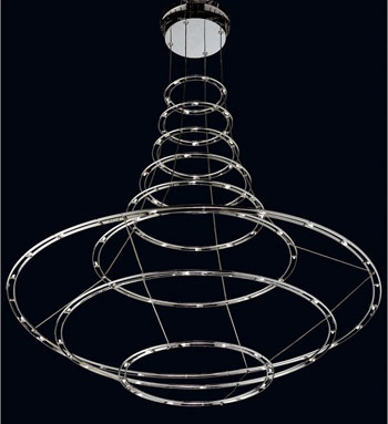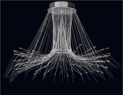 吊燈有著啟發(fā)性設(shè)計和強烈沖擊感。精細(xì)閃耀的重復(fù)線條向周圍擴散,就像王冠。彎曲和拉緊的線條相結(jié)合,使其特別適合于所表現(xiàn)的氛圍。