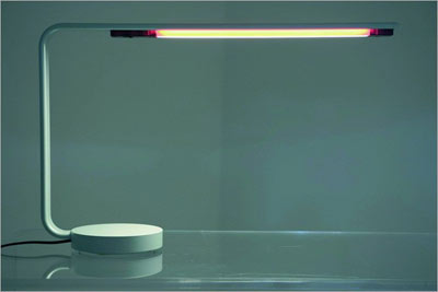 這款臺燈達(dá)到一種驚人的純圖形境界,擠壓鋁制成的單線條,再加上革新的小型熒光燈管,如此簡約的框架,好比“一根會發(fā)光的帶子”。