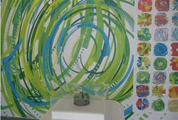 另外整個展覽是白色的,大部份設(shè)計及墻壁都是白色。Marius Watz在一片空白上噴繪出華麗的色彩。他的“照明B”(Illuminating B)模型,是100個高辨識率矢量圖像的序列。這項設(shè)計的軟件版本在二月被用于制作Club Transmediale 07的視覺效果。