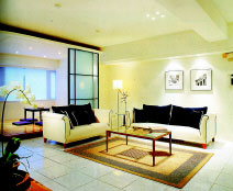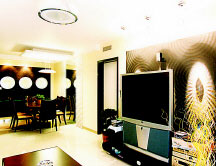 與客廳相連的茶室里用有節(jié)律分布的筒燈來(lái)代替室內(nèi)主射燈,從而使規(guī)則排布的條形假梁閃現(xiàn)出幾分靈動(dòng)的氣息,與棕色木地板、滕椅、方桌相和諧,展示柜的處理極為簡(jiǎn)潔,在櫻桃木的映襯下,幾盞精巧的內(nèi)置燈將主人的愛(ài)物和盤(pán)托出,平和、大度和休閑的氣氛便油然而生。
