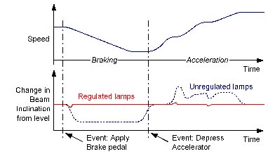 前大燈自動校平系統(tǒng)的工作原理是在車輛傾斜的情況下仍保證燈光與路面呈水平狀態(tài)(見下圖)。車輛處于停止?fàn)顟B(tài)時可能會由于某些原因而傾斜,例如有乘客上車,或裝行李,甚至是給油箱加油。同樣的,當(dāng)車輛處于行進(jìn)狀態(tài)時,也會由于剎車或加速而導(dǎo)致車輛傾斜。在這兩種情況下,車前大燈都必須保持與公路水平的狀態(tài)。前大燈自動校平系統(tǒng)根據(jù)傳感器的一系列數(shù)據(jù),尤其是從前后車軸傳來的懸架壓縮數(shù)據(jù)調(diào)節(jié)各車燈的角度。