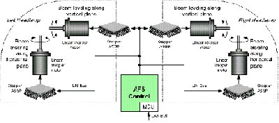 每臺車輛前大燈的轉(zhuǎn)動都是通過使用步進(jìn)電機而實現(xiàn)的,其中,一臺步進(jìn)電機控制垂直方向上的轉(zhuǎn)動,另一臺用于控制水平方向上的轉(zhuǎn)動(見下圖)。電機根據(jù)車輛四周的許多傳感器反饋的數(shù)據(jù)作出反應(yīng)。信息的傳達(dá)是通過車輛的數(shù)據(jù)網(wǎng)絡(luò)系統(tǒng)實現(xiàn)的。LIN總線是前大燈控制的一個實用的選擇,而CAN總線則能夠?qū)鞲衅鲾?shù)據(jù)收集起來并且分配到整個車輛。步進(jìn)電機是前大燈調(diào)節(jié)應(yīng)用的一個最佳選擇,因為這些電機成本低,堅固耐用,體型雖小卻能夠提供一個很大的扭矩。