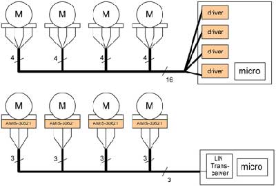 上述兩種型號(AMIS-30621和AMIS-30623)器件的特色在于以LIN總線為接口。相較于將驅(qū)動器置于遠(yuǎn)端的系統(tǒng),這一方法節(jié)省了布線成本,并且擁有更好的電磁兼容性能,這一優(yōu)勢是在汽車應(yīng)用中遇到困難時解決問題的關(guān)鍵。其余兩種改進(jìn)型(AMIS-30622和AMIS-30624)擁有I2C的串行接口,能夠作為單一印制電路板上與微控制器相鄰的外圍器件。