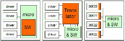 所謂的轉(zhuǎn)換集成電路,在微控制器與驅(qū)動器芯片之間提供接口,總體解決方案添加了一些額外的硬件,但同時也導(dǎo)致了更難以管理的復(fù)雜性及更多的軟件需求(見下圖,右方圖片)。使用轉(zhuǎn)換芯片的不利之處在于使得印制電路板的設(shè)計變得更復(fù)雜,同時失去一些模塊化的優(yōu)勢。