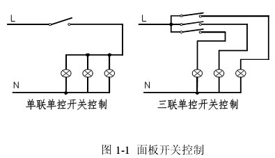 蹺板開關(guān)設(shè)置于門口,對于面積較大的房間燈具較多時(shí),采用雙聯(lián)、三聯(lián)、四聯(lián)開關(guān)或多個(gè)開關(guān),其原理接線圖見圖1-1。