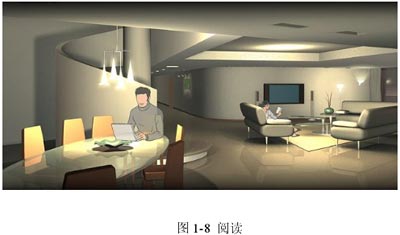 在一定場所或整個(gè)樓宇,用戶預(yù)設(shè)多種場景,按動(dòng)一個(gè)按鍵,即可調(diào)用要的場景。圖1-5至1-8為場景變換狀態(tài)。