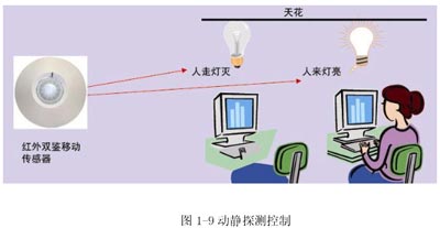 在一定場所或整個(gè)樓宇,根據(jù)人員走動(dòng)情況進(jìn)行開關(guān)燈的一種方式。見圖1-9。