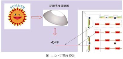 根據(jù)探頭探測到的照度來控制照明場所內(nèi)相關(guān)燈具的開啟或關(guān)閉,保持場所的照度恒定。見圖1-10。