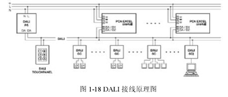 安裝 DALI 接口有 2 條主電源線,二條控制線,對線材無特殊要求,安裝時(shí)也無極性要求,只要求主電源線與控制線隔離開,控制線無需屏蔽,要注意的是當(dāng)控制線上電流在 250mA,線長 300 米時(shí)壓降不超過 2V??刂凭€和電源線可并行,無需另外敷線。設(shè)計(jì)緊湊的控制組件無需專門的控制柜,因此安裝簡便且經(jīng)濟(jì)。接線原理見圖1-18。