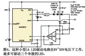 對于圖3中的單LED電路,MAX1685的起始電壓定義了最低為2.7V的輸入電壓范圍。圖1中電路和圖2中電路最大電流分別為0.5A和1A。最大極限工作電壓還是6.5V。電路一旦開始運行后,就向LED供電來輸入低達1.7V的電壓。圖1、2、3中電路的應(yīng)用包括頭燈,手電筒,及任何其它由三或四節(jié)堿性原電池、鎳氫/鎘鎳二次電池或單節(jié)鋰二次電池供電的便攜燈具。