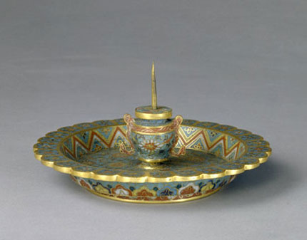 燭臺(tái)銅胎鎏金,圓盤(pán)形,菊瓣式邊,盤(pán)心置一寶瓶式鎏金長(zhǎng)阡。盤(pán)內(nèi)壁掐絲琺瑯天藍(lán)地上壓纏枝菊花紋。盤(pán)外壁及底藍(lán)地上飾多色釉勾云紋,盤(pán)底中心綠地長(zhǎng)方框內(nèi)朱紅楷書(shū)“大明萬(wàn)歷年造”六字款。