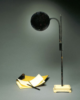 遮燈玳瑁制,由方體長(zhǎng)桿及其上部可插接拆卸的圓片組成,下配象牙雕花四足基座。遮燈另附一象牙冊(cè)頁(yè),冊(cè)頁(yè)內(nèi)頁(yè)為象牙制,長(zhǎng)方形,其薄如紙,一側(cè)相互粘連,可以自由翻動(dòng),外套以玳瑁制折疊函套,并以鐵鋄金掛鉤扣合。函套內(nèi)壁粘貼一層明黃色錦為飾,另配一支玳瑁管鉛筆。(撰稿人:劉岳)