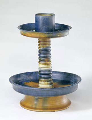燭臺(tái)的使用早見(jiàn)于春秋時(shí)代,《楚辭》中引“室中之觀多珍怪,蘭高明燭華容備。”戰(zhàn)國(guó)時(shí)已有各式精制的銅燭臺(tái),至三國(guó)、兩晉時(shí),青瓷燭臺(tái)便已出現(xiàn),造型頗多。這件唐三彩燭臺(tái)造型實(shí)用古樸,施釉均勻,色彩深沉雅致,又在三彩中點(diǎn)以藍(lán)彩,更增添了器物的華貴韻致,是三彩器的上乘之作。