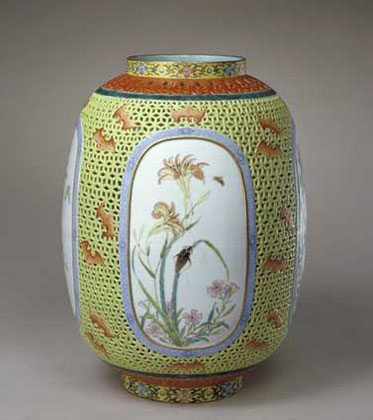 燈罩直口,長(zhǎng)腹,圈足。形似燈籠,中空,口底相通???、足上各繪黃地粉彩朵花紋一周,肩、脛均施抹紅鏤空變形蕉葉紋,腹部為鏤空綠地粉彩錢紋綴以紅蝠,四面各有一開(kāi)光,開(kāi)光內(nèi)繪白地粉彩四季花蝶草蟲(chóng)紋。開(kāi)光四周施藍(lán)地粉彩纏枝菊花紋一周。
