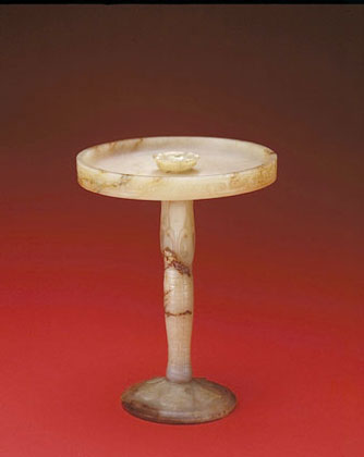 戰(zhàn)國(guó)時(shí)期出現(xiàn)了百家爭(zhēng)鳴的新形勢(shì),社會(huì)環(huán)境和人文氛圍較以前有了很大的改變,玉雕作品的風(fēng)格也為之一新,新穎的造型和先進(jìn)的工藝成為創(chuàng)作的主流,開(kāi)創(chuàng)了玉雕史上新的藝術(shù)流派。本器的座、柱、盤(pán)分別由三塊玉雕成,嵌粘密實(shí),紋飾精美,富有層次感,顯示出精湛的雕刻技術(shù)。造型設(shè)計(jì)獨(dú)具匠心,燈柱上部處理成三棱形,下部為圓柱形并收腰,于簡(jiǎn)單流暢的造型中又顯露出豐富的變化。目前所知,此燈為孤品。(撰稿人:趙桂玲)
