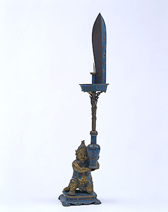 燈座造型為一胡人單腿跪于方座之上雙手托舉觀音瓶,瓶上置蠟釬,燈盤(pán)一側(cè)有蓮瓣形燈擋。通體以藍(lán)色琺瑯釉為地,瓶身及燈盤(pán)等處飾彩色纏枝蓮紋。胡人深目高鼻,胡須濃密,身穿罩甲,甲飾纏枝蓮及菊花紋,并于前身后背飾各色“壽”字,人物的頭、腿、足部均鍍金,面部表情豐富生動(dòng)。此器釉色灰暗,砂眼較多,為清早期掐絲琺瑯作品的風(fēng)格。燈座的胡人形象反映了中西文化的交流與融合。(撰稿人:陳麗華)
