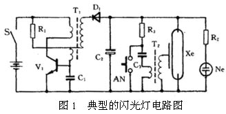 目前常用的閃光燈電路大多是高壓閃光燈電路,它由振蕩電路、升壓變壓器、儲(chǔ)能大電容器、高壓線(xiàn)圈、惰性氣體閃光燈組成,典型電路圖如圖1。
