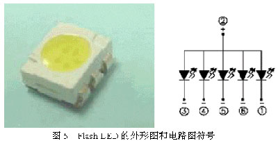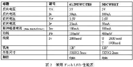 Flash LED的外形圖和電路圖符號(hào)如圖5所示。Flash LED的主要技術(shù)參數(shù)是亮度(IV)、視角、前向電壓(VF)、前向電流(IF)、功耗(Pd)、峰值電流IF(Peak)、外形尺寸。表2是常用Flash LED性能表。