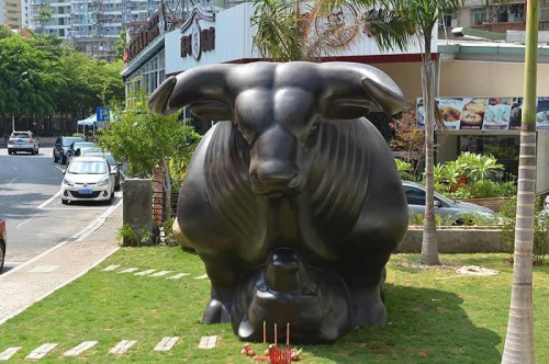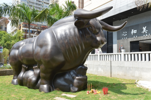 這是由廈門知名收藏家蔡銘超耗資百萬定制的一尊世上最大“牛壓熊”雕塑。這尊雕塑長6.1米,高3.4米,寬2.9米,重3噸多,采用銅材質(zhì)、鑄造工藝打造,造型是牛身下壓著一只熊。從雕塑外表看,牛和熊很容易讓人聯(lián)想起股市,而這正是制作者蔡銘超的意圖。他表示,這座雕塑寄托了廣大股民的希望:牛市永遠(yuǎn)強勁,熊市無法抬頭。