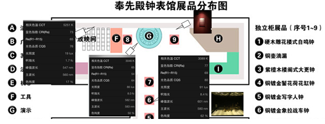 整個(gè)陳列區(qū)鐘表展品多,應(yīng)采用顯指大于90的高顯色光源及燈具。而且場(chǎng)景中紅色較多,若使用LED光源或節(jié)能燈時(shí),應(yīng)注意R9的大小。
