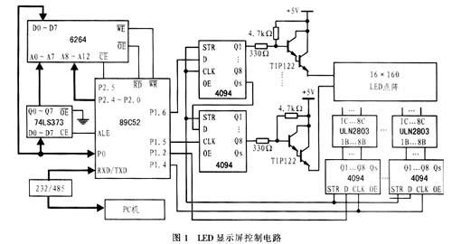 具體的LED顯示屏控制電路如圖1所示。整個(gè)電路由單片機(jī)89C52、點(diǎn)陣數(shù)據(jù)存儲(chǔ)器6264、列驅(qū)動(dòng)電路ULN2803、行驅(qū)動(dòng)電路 TIP122、移位寄存器4094及附屬電路組成。該電路所設(shè)計(jì)的電子屏可顯示10個(gè)漢字,需要40個(gè)8×8 LED點(diǎn)陣模塊,可組成16×160的矩形點(diǎn)陣。由于AT89C52僅有8k存儲(chǔ)空間,而顯示的內(nèi)容由PC機(jī)控制,因此不可能預(yù)先把需要顯示的內(nèi)容做成點(diǎn)陣存在單片機(jī)中,而只能由PC機(jī)即時(shí)地把所需顯示的點(diǎn)陣數(shù)據(jù)傳給單片機(jī)并存入緩沖區(qū)6264。