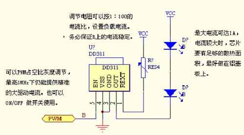 DD311 是一單通道輸出的LED恒流驅(qū)動器,內(nèi)建電流鏡與電流開關(guān)組件,是專為驅(qū)動大功率LED而設(shè)計(jì)的芯片.DD311可驅(qū)動高達(dá)1安培的沈入電流(sink current),并可透過調(diào)整參考輸入電流(IREF)來任意設(shè)定輸出電流的大小.輸出電流值約為100倍的IREF,IREF可由調(diào)整外掛電阻或偏壓 (bias)電壓來設(shè)定.微調(diào)或使能偏壓電壓可校正LED間的亮度不一或?qū)崿F(xiàn)多顆LED間整體亮度同時調(diào)整.芯片的輸出端可承受高達(dá)36V的電壓,支持多顆大功率LED的串接應(yīng)用.內(nèi)建輸出使能端(Enable),可輕易地實(shí)現(xiàn)大功率LED的高灰階應(yīng)用。
