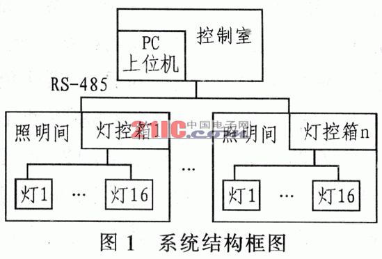 遠(yuǎn)程燈控箱系統(tǒng)的結(jié)構(gòu)如圖l所示,其中,PC上位機(jī)放在控制室里,各燈箱就近放置在照明設(shè)備附近。由PC上位機(jī)發(fā)送控制指令,通過RS-485總線將指令串行傳送給各遠(yuǎn)端燈控箱,這樣就可在控制室里實(shí)時開關(guān)控制,查詢各個燈的狀態(tài)。從傳輸距離和性價比方面考慮選用RS-485總線。RS-485為平衡線路,可實(shí)現(xiàn)遠(yuǎn)距離、多節(jié)點(diǎn)控制。本設(shè)計(jì)的重點(diǎn)是燈控箱。下面將以一臺燈控箱為例介紹系統(tǒng)的軟件和硬件設(shè)計(jì)。