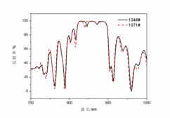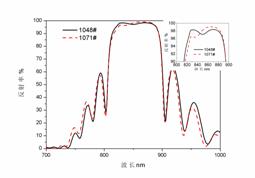 對(duì)于傳統(tǒng)紅黃光LED,這種厚度信息對(duì)DBR反射層信息的干擾也許可以忽略,但是對(duì)于RCLED影響卻相當(dāng)大,以至于不能準(zhǔn)確分析諧振腔的參數(shù)。一個(gè)實(shí)際RCLED結(jié)構(gòu)中包含被稱(chēng)為電流擴(kuò)展層的厚層,我們根本無(wú)法確定光學(xué)凹陷的位置,如圖2,RCLED全結(jié)構(gòu)的反射率曲線(xiàn),兩個(gè)批次間隔20爐投片。