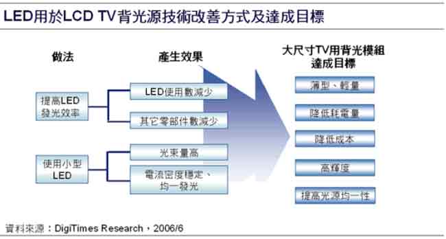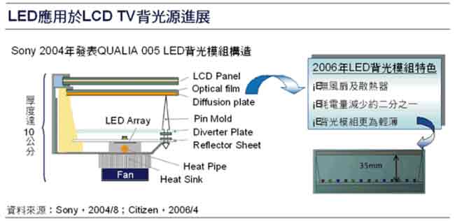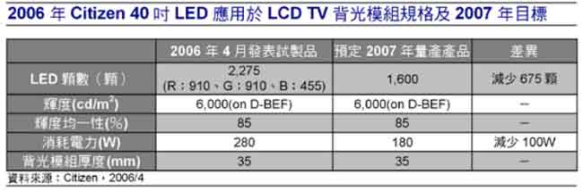 LED大廠Citizen于2006 年4月發(fā)表40 寸LED背光模塊試制品,LED使用顆數(shù)為2,275顆、耗電量達(dá)280W,2007 年目標(biāo)為LED 使用顆數(shù)降為1,600顆、耗電量為180W。