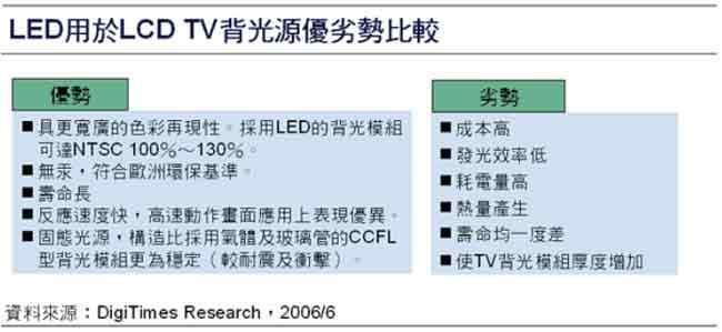 然而,即便2者價(jià)差仍大,許多TFT LCD 大廠計(jì)劃2006 年下半,于商用市場推出采LED背光模塊的 TV用LCD,如韓商三星電子計(jì)劃推出40寸產(chǎn)品、LPL計(jì)劃推出42寸以上產(chǎn)品,臺(tái)廠友達(dá)及奇美亦有類似計(jì)畫。