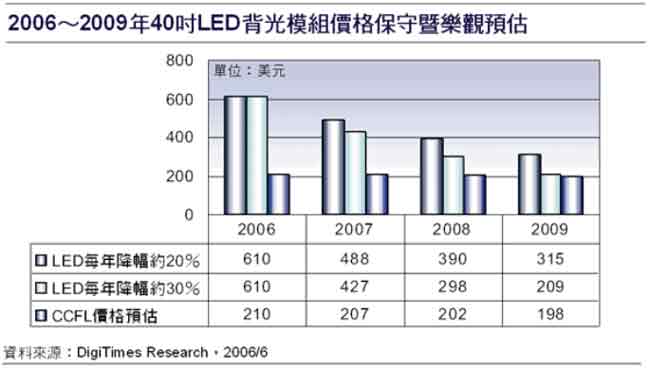 雖然LED廠商針對LED于背光源技術(shù)較弱部分已做大幅度改善,然LED與CCFL背光模塊仍存在極大價(jià)差。2006 年下半40寸LED背光模塊價(jià)格預(yù)估平均約為610美元,CCFL 為210美元,2 者差距約為3 倍。