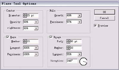 如果需要精確設(shè)置,可雙擊眩光工具對打開話框,如圖2。在這里可以調(diào)節(jié)眩光的中心、光圈、光線;也可使用Object>Expand命令對眩光中的單個元素進(jìn)行編輯。對話框中各部分屬性說明如下: