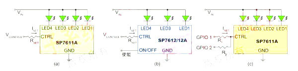 在手機(jī)背光應(yīng)用中需要調(diào)節(jié)亮度,SP761x系列的LED驅(qū)動(dòng)器可以通過(guò)多種方式來(lái)調(diào)節(jié)亮度: