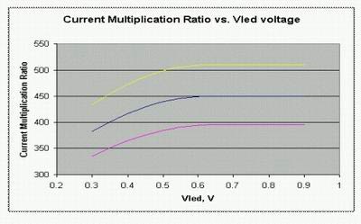 圖3:LED電流的放大倍數(shù)跟LED的導(dǎo)通壓降的關(guān)系曲線(xiàn)圖。