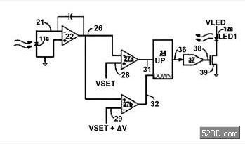 在(圖四)中,標(biāo)記為22的積分電路可以輸出一個(gè)受到光二極管(11a)上光量控制的電壓,這個(gè)電壓與VSET比較,比較器的輸出能控制計(jì)數(shù)器數(shù)值的增加或減少,計(jì)數(shù)器的輸出則是用來推動(dòng)一個(gè)數(shù)字模擬轉(zhuǎn)換器(37),進(jìn)而控制LED的驅(qū)動(dòng)電流。
