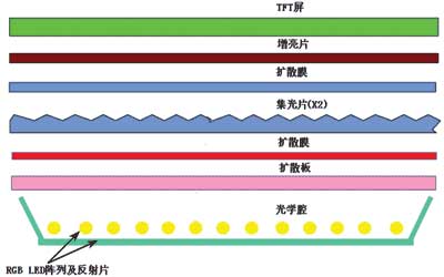 光源發(fā)出的光經(jīng)過(guò)光學(xué)腔(腔壁采用高效漫反射片)混合后,再經(jīng)過(guò)各種必要的光學(xué)膜片后,得到屏前(FOS)要求亮度。光學(xué)膜片一般包括擴(kuò)散板(diffuser)、集光片(BEF)、增亮片(DBEF)、TFT屏和減反層等,如圖1所示。