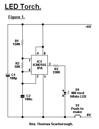 LED手電筒的核心是一個7555時基集成電路(不能使用普通的555)。一個白色的發(fā)光二極管(如果你找不到,只能用別的顏色代替)工作時發(fā)出的亮度大約為400mcd,這樣當聚焦時,可照亮30米遠的物體。