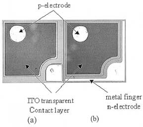 在LED芯片的制作過程中,要想得到光電性能良好的芯片,首要條件就是有一個(gè)合理的圖形設(shè)計(jì),因?yàn)樗鼪Q定了電流擴(kuò)展的情況,只有均勻擴(kuò)展的結(jié)構(gòu)才有著良好的穩(wěn)定性。電流的均勻擴(kuò)展能夠避免對(duì)局部注入的電流相對(duì)過大而使那一點(diǎn)處的結(jié)溫局部過高致使p-n結(jié)燒毀,這對(duì)于工作電流較高的功率型芯片尤為重要。因此,要想得到好的穩(wěn)定性就要先有一個(gè)合理的圖形結(jié)構(gòu)。