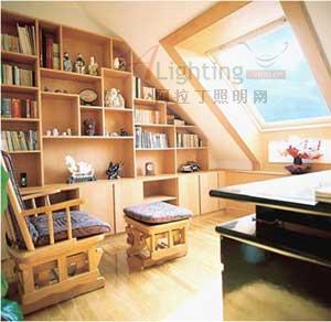 書房空間有明顯的功能傾向,一般以雅致、寧靜的氣氛為佳。于是,在這種功能至上的環(huán)境中,燈具的形式一定不能成為空間的主角,也就是說,書房的照明布置的原則是以滿足照度要求為準(zhǔn)。需要注意是不要在書房里裝射燈,由于其光線的刺激、突兀,有可能會造成眩光。
