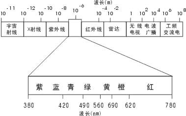 人類視覺能感受到的電磁波可見部分的波長范圍大約在380nm至780nm之間(1nm=10 -6mm),而不同波長的光給人的顏色感覺也不同。波長從 380nm向780nm遞增時,光的顏色從紫色開始,按藍、青、綠、黃、橙、紅的順序逐漸變化,兩種顏色之間沒有明顯的分界。將全部可見光波混合在一起就形成日光,即白色光。