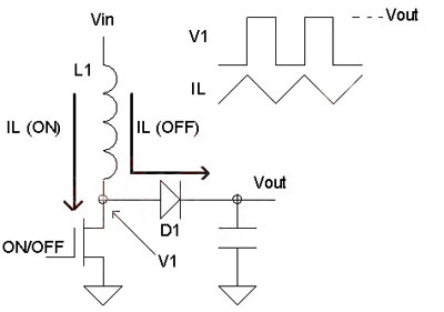 升壓電路如圖所示,當(dāng)圖1中的開關(guān)導(dǎo)通時(shí),輸入電壓加壓在電感L1的兩端,引起電感L1電流線性增加。在導(dǎo)通的最后階段,電感電流增加到峰值Ipeak = Vin*Ton/L,此時(shí)開關(guān)關(guān)斷。存儲(chǔ)在電感中的能量會(huì)使節(jié)點(diǎn)V1的電壓升高并超過(guò)Vin,直至使D1正向偏置而導(dǎo)通。此時(shí)電感電流通過(guò)D1泄漏。在開關(guān)關(guān)斷期間,電感電流以(Vout–Vin)/L的斜率下降。