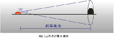 這是隧道入口前的部分路面,嚴(yán)格說(shuō)來(lái)它不是隧道部分。在這一區(qū)域駕駛員必須能夠看清隧道內(nèi)部和可能的障礙物,才不至于降低車速。這一區(qū)域的駕駛員的亮度適應(yīng)情況將決定了下一區(qū)域需要的亮度水平。CIE計(jì)算這個(gè)亮度適應(yīng)的方法是L20方法,它計(jì)算的是在進(jìn)入?yún)^(qū)的起點(diǎn)以駕駛員的視線為中心的20的視角范圍內(nèi)四周、天空及路面的平均亮度(如圖2所示)。很明顯白天的亮度要明顯高于晚間,因此隧道照明白天的要求更高。