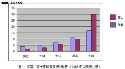 2006年,兩個企業(yè)雙雙邁過10億元(銷售額)的門檻。歐普1996年就投身于這個行業(yè),而雷士1999年才注冊成立,從發(fā)展速度上看, 雷士顯然更勝一籌。年初對2007年的銷售預測中,雷士以30億元位居 榜首,幾乎超越歐普17億元的一倍,兩個競爭品牌的差異為什么這么巨大?詳細