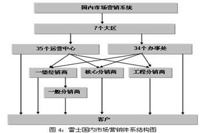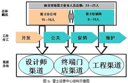 雷士和當?shù)亟?jīng)銷商共同在全國建立了35個運營中心,運營中心負責其轄區(qū)內(nèi)的市場運營和管理,而這35個運營中心則是完全 受雷士7個大區(qū)總監(jiān) 的領導;另外雷士還在全國設立了34個辦事處以協(xié)助各運營中心掌控市場,辦事處和運營中心分工合 作,優(yōu)勢互補。 詳細