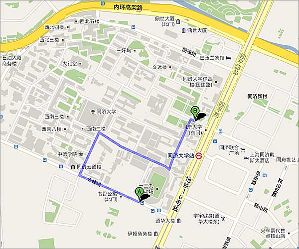 地點(diǎn):上海市楊浦區(qū)四平路1239號(hào)同濟(jì)大學(xué)本部校區(qū) 逸夫樓一樓 步行:學(xué)校正門(mén)(東門(mén))進(jìn)入,電子屏幕路口左轉(zhuǎn)即到(見(jiàn)下圖白色建筑) 地鐵:10號(hào)線同濟(jì)大學(xué)站可到學(xué)校正門(mén) 自駕車(chē):最近同濟(jì)大學(xué)國(guó)康路校門(mén)車(chē)無(wú)法進(jìn)入,所有車(chē)輛都停在赤峰路18號(hào)停車(chē)場(chǎng)(靠近校南門(mén),即赤峰路校門(mén))。 下圖為從停車(chē)場(chǎng)到會(huì)場(chǎng)逸夫樓的步行路線圖。圖中A為停車(chē)場(chǎng),B為逸夫樓。