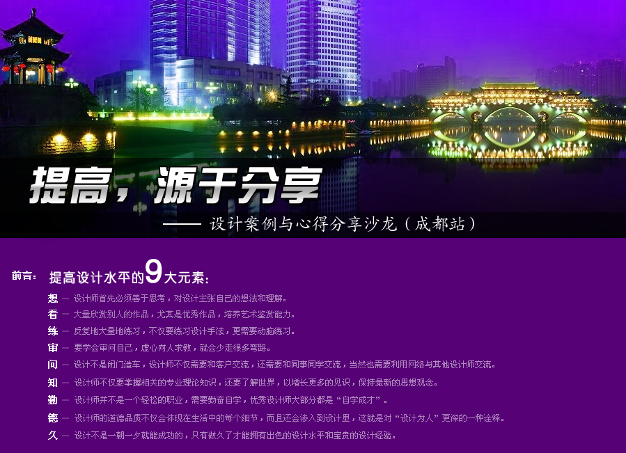 為建立設(shè)計師面對面交流學習的平臺,協(xié)助設(shè)計師提高設(shè)計水平,阿拉丁照明網(wǎng)于11月19日在成都舉辦設(shè)計案例與心得分享沙龍,各大設(shè)計師共同參與縱談?wù)彰髟O(shè)計! >>詳細請點擊