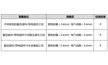 爬電距離與電氣間隙同樣是產(chǎn)品安全運行的重要憑據(jù),當這個間隙小到一定程度時,在電場的作用下,空氣介質(zhì)就會被擊穿,絕緣失效或暫時失效,引發(fā)安全問題。本次樣品爬電距離與電氣間隙滿足標準要求的最小安全距離,產(chǎn)品可以安全運行。