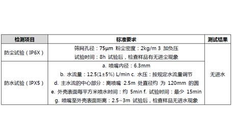 IP等級是衡量戶外燈具的一個重要指標,進水可能引發(fā)安全問題,進塵則會影響燈具正常發(fā)光。此次樣品IP等級為65,實驗嚴格按照標準對IP65相關(guān)要求進行測試,測試過程中無進塵與進水現(xiàn)象發(fā)生......[詳細]