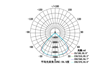 從配光曲線上看,燈具發(fā)光依軸線均勻排布,平均光束角94.9度,呈典型的寬光型,更適合中高距離以及公共區(qū)域范圍內(nèi)的應(yīng)用。