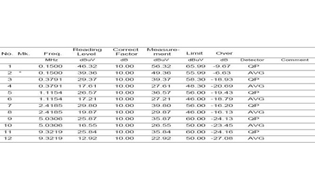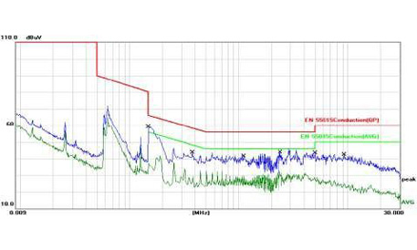 L線 通過;N線 通過(符合標(biāo)準(zhǔn))。測試期間,我們將樣品放置在離地面0.8米高的桌上,通過線路阻抗穩(wěn)定網(wǎng)絡(luò)(L.I.S.N.)連接到交流電源,并提供了一個50歐姆耦合阻抗的測試設(shè)備。按照EN 55015規(guī)定進(jìn)行排放測量。